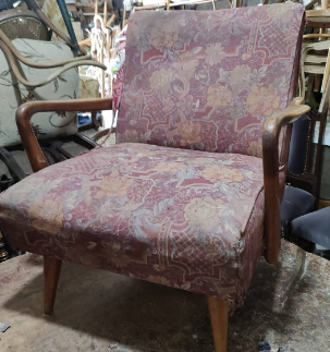 Sillón con tapizado decorativo y estructura robusta, perfecto para una sala vintage.
