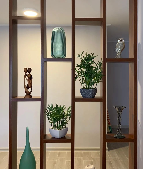 Estantería curva de madera, ideal para organizar libros o decoraciones en una sala o estudio.
