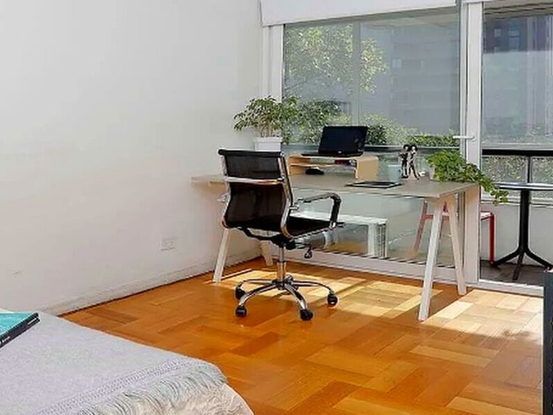 Desde el hall se puede entrar a la cocina (equipada con cocina a gas) y a una amplia despensa. Luego, está el living-comedor con salida a la terraza que, junto a la zona de servicio se habilitó como logia (con calefón y conexión a lavadora y secadora) y recorre hasta el otro extremo del departamento, permitiendo acceso a ella a los dos dormitorios.