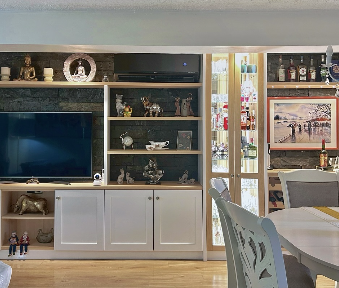 Estantería grande para libros, combinada con un sillón de lectura cómodo.