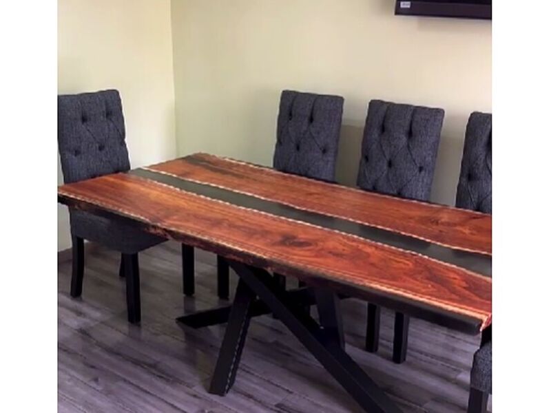 Todo hecho en madera aromo australiano y resina epoxy negro humo, bases en fierro con pintura electrostática.