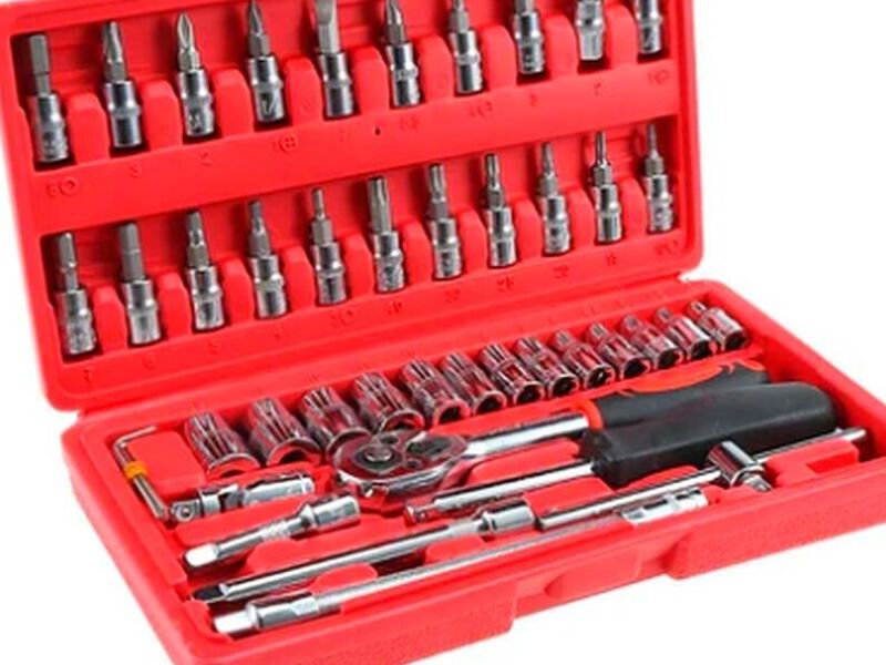 Caja de herramientas de 46 piezas, de cromo vanadio y acero al carbono, ideal para el coche, hogar, reparación de bicicletas, etc. Ofrece máxima resistencia y durabilidad.