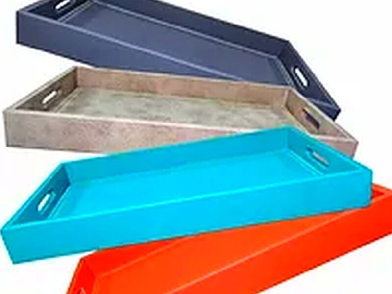 Bandejas recubiertas con eco cuero, cocidas con hilo beige. Dimensiones 50x30x5cm en sus distintos colores.