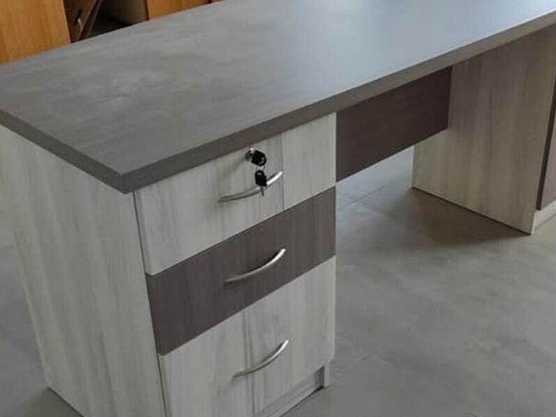 Escritorio en tono gris y blanco.