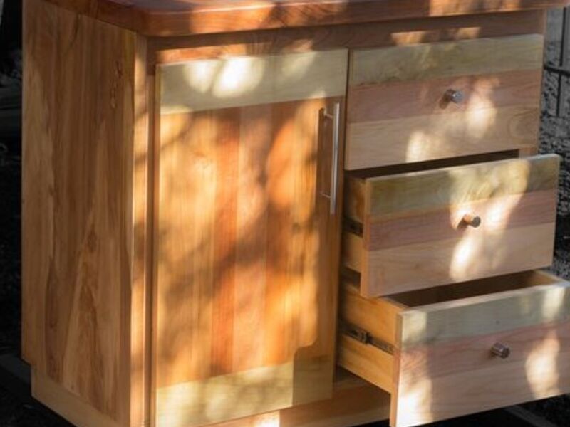Este es el mueble de cocina más pequeño que he realizado, pero que forma parte de un conjunto de 6 metros que sigue la misma linea. Para este proyecto se utilizó madera de Raulí, Coigue, Laurel, Lenga y Avellano