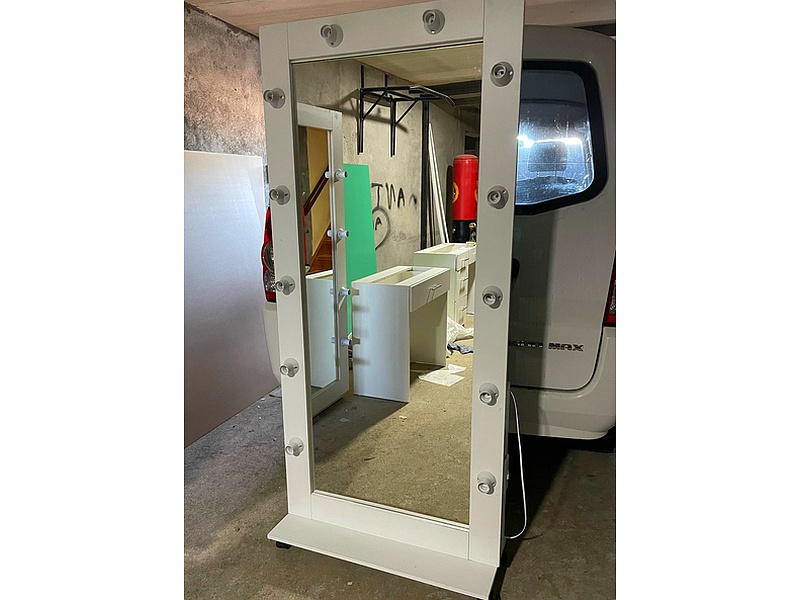 Espejo con Luz en melamina color blanca. Tiene ruedas para fácil movilidad, 12 luces (no incluye ampolletas). Medidas 170 de alto x 80 de ancho.