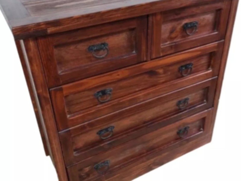 La cómoda Vic Mon modelo Rústico está fabricada en madera de pino de alta calidad con un acabado galvanizado en un elegante color chocolate. Este mueble clásico y robusto cuenta con cinco cajones amplios, cada uno equipado con correderas de madera para un funcionamiento suave.