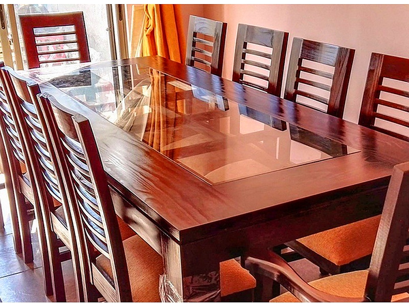 Comedor de 2.4 x 1 m con 8 sillas en tono chocolate. La mesa de amplio tamaño proporciona suficiente espacio para reuniones y cenas, mientras que las sillas en tono chocolate complementan el conjunto con un acabado elegante y cálido.