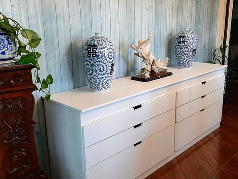 Un mueble con varios cajones, de color blanco, utilizado para guardar ropa, documentos u otros objetos.