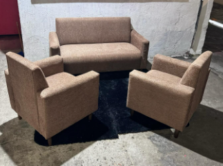 Juego de sillones de tapizado beige con mesa central de madera, ideal para salas de estar.