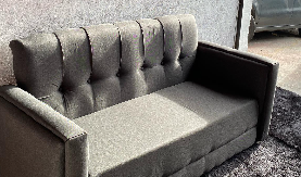 Sofá con tapizado en gris oscuro y cojines decorativos, ideal para salas sofisticadas.