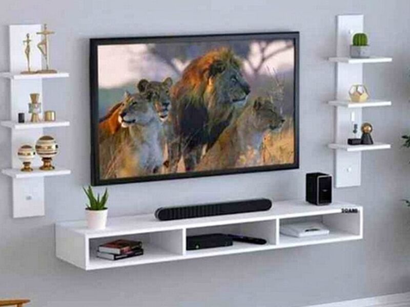 El rack flotante con repisas laterales es un mueble diseñado para montarse en la pared, ofreciendo una solución moderna y estilizada para el almacenamiento de equipos multimedia y decoración.