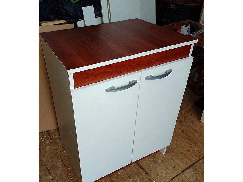 Mueble de cocina en melamina con dos puertas, dimensiones de 63 cm de ancho, 48.5 cm de fondo y 83 cm de alto. Ideal para organizar utensilios con un diseño compacto que se adapta a cualquier cocina.