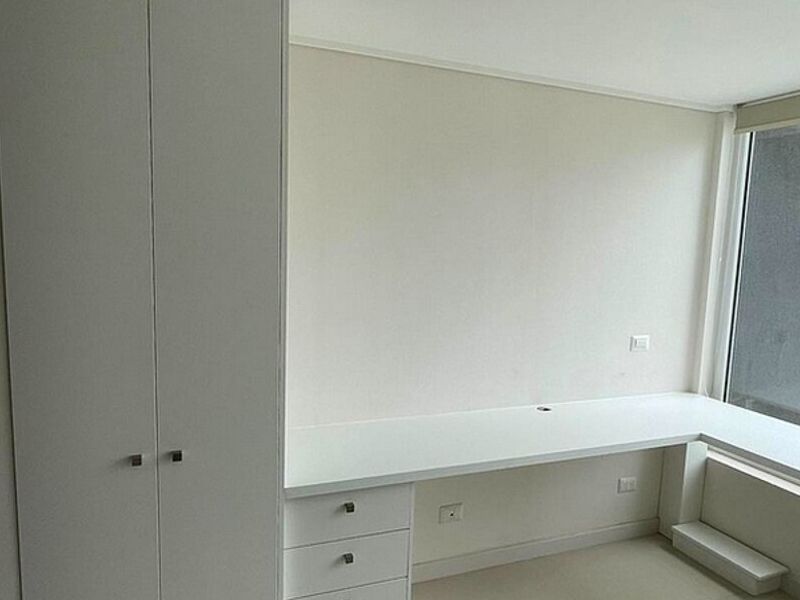 Un largo escritorio en L con cajonera para trabajar desde casa además de un espacio para guardar ropa.