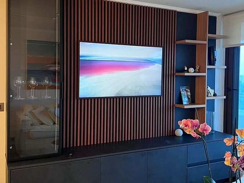 Un lindo rack de TV que completa la elegancia y buen gusto que tienen sus dueños. Con un lindo panel ranurado detrás del TV.