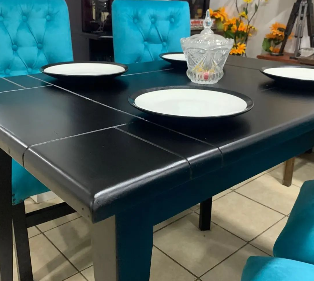 Mesa de comedor con espacio para guardar botellas de vino y utensilios.
