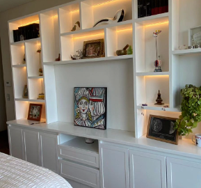 Estantería con diseño empotrado e iluminación incorporada, ideal para exhibir objetos.