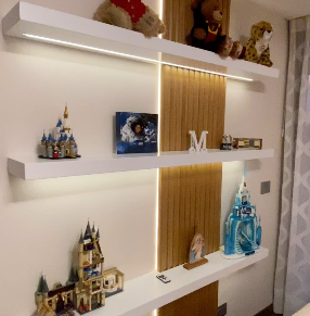 Librero alto y modular, con estructura blanca y estantes de madera clara.