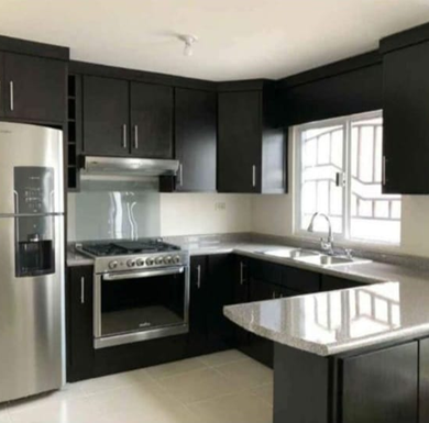 La cocina presenta un diseño en forma de "L" que optimiza el espacio y facilita el flujo de trabajo