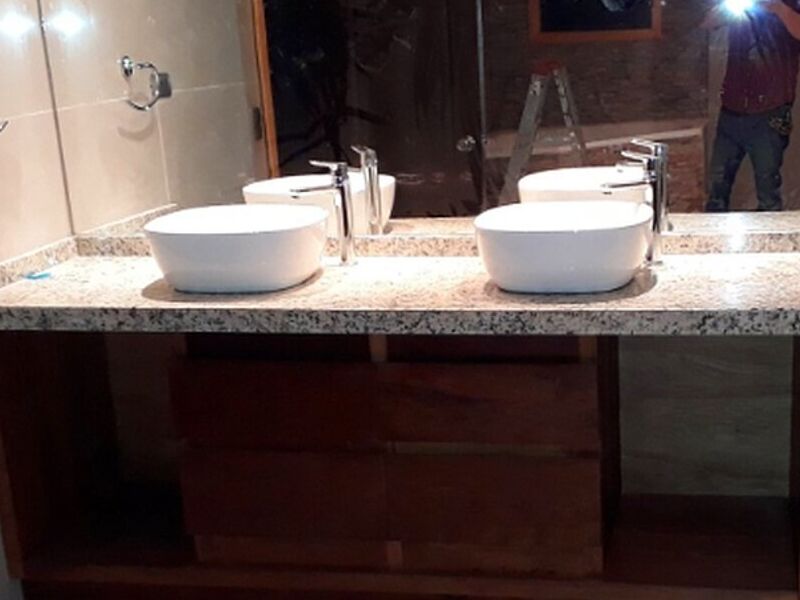 Mueble de baño constituido por un lavatorio alojado en una mesada con cajones y estantes, y por lo común puertas.