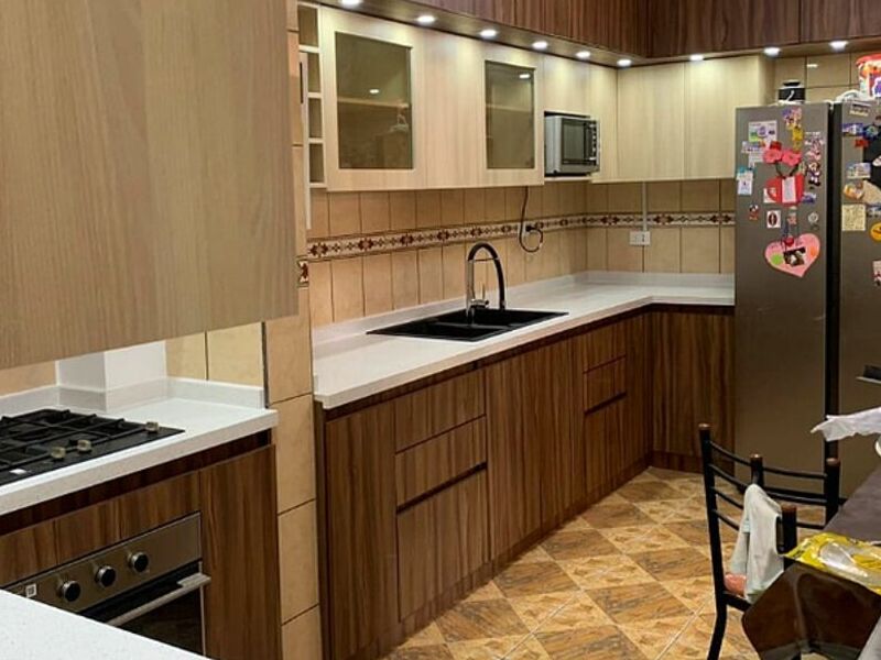 Una cocina completa fabricada en melamina ofrece una solución asequible y duradera para el diseño de interiores. Este material permite una personalización fácil y una apariencia elegante.