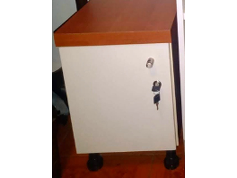 Material: Parece estar construido con aglomerado o MDF, un material comúnmente utilizado en la fabricación de muebles. La superficie está recubierta con un laminado, posiblemente de melamina, en dos tonos: un tono más oscuro para la parte superior y un tono más claro para el cuerpo del mueble.
