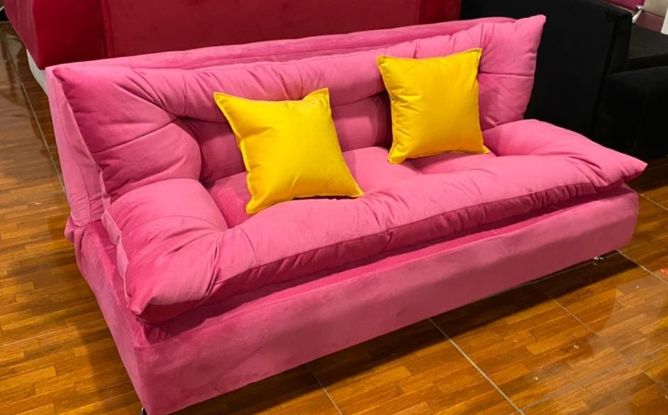 Tapizado en terciopelo de color rosa vibrante, suave y elegante.