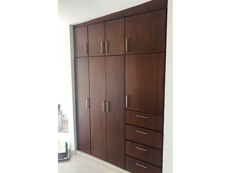 Closet café: El closet en tono café ofrece un estilo clásico y cálido, ideal para quienes buscan un mueble resistente y con mucha capacidad de almacenamiento. Su color oscuro y la textura de la madera hacen que se integre perfectamente en ambientes tanto modernos como tradicionales.