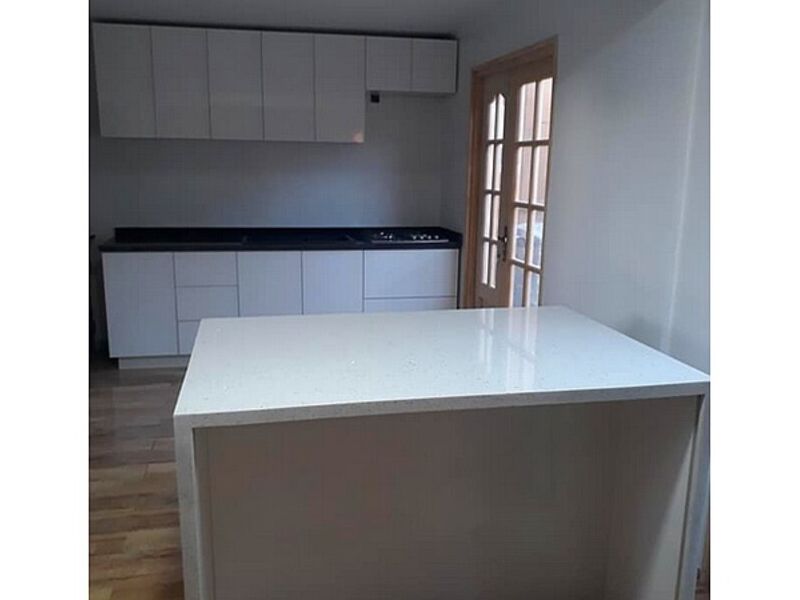 Cocina Blanca Alto Brillo sistema Push-On. Con Cubierta Cuarzo colores Blanco y negro espejuelo.