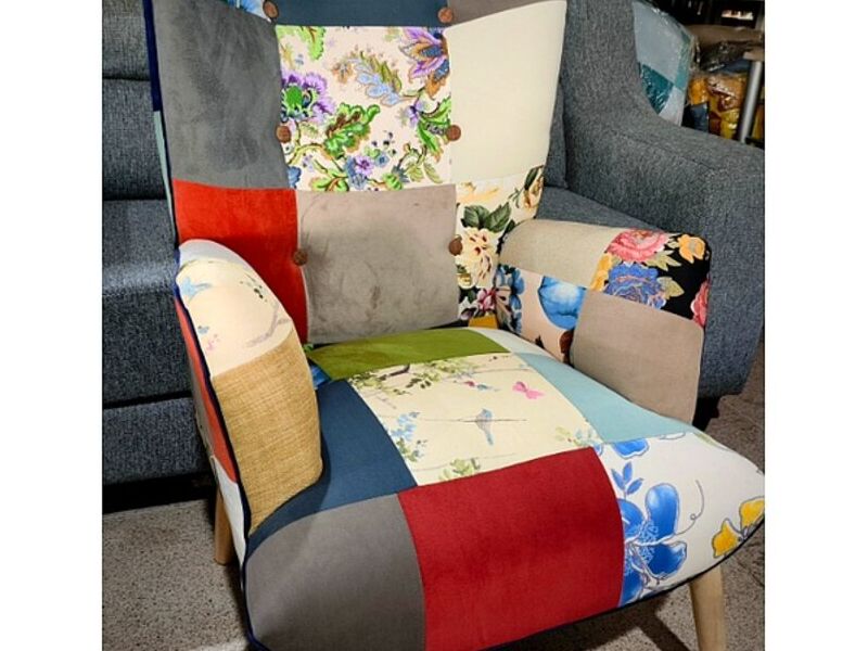 La poltrona Sony presenta un diseño único y llamativo con una combinación de telas variadas, que pueden incluir felpa, lino, diseño y tela Tucuman, en un estilo PatchWork.