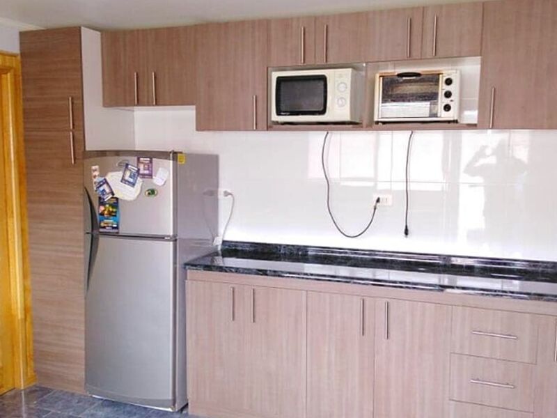 Conjunto de muebles de cocina dispuestos en una sola línea, fabricados con tableros de melamina. Este diseño es ideal para espacios estrechos y alargados, proporcionando una distribución eficiente del espacio.