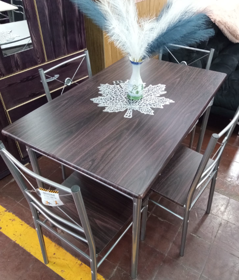 Incluye mesa rectangular con superficie de melamina de alta resistencia y 4 sillas con estructura metálica.