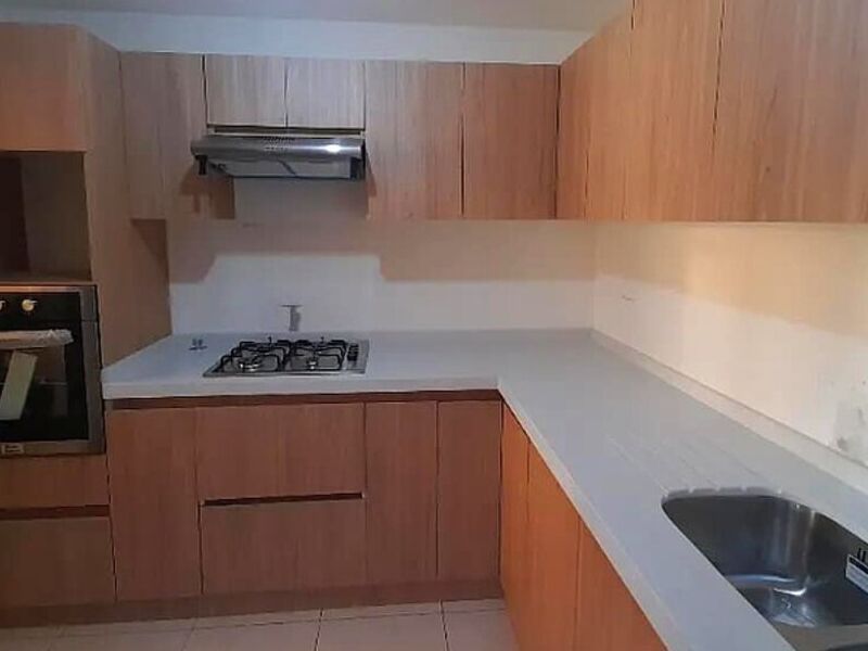 Cocina cuyos muebles están fabricados en melamina, material versátil y económico.
