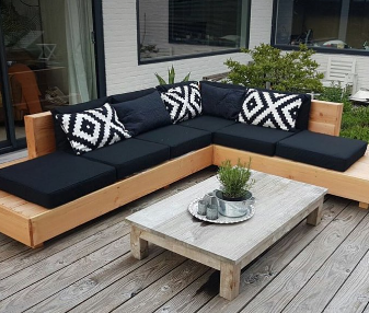 Conjunto de muebles de exterior en madera, ideales para terrazas o jardines, con diseño rústico y elegante.