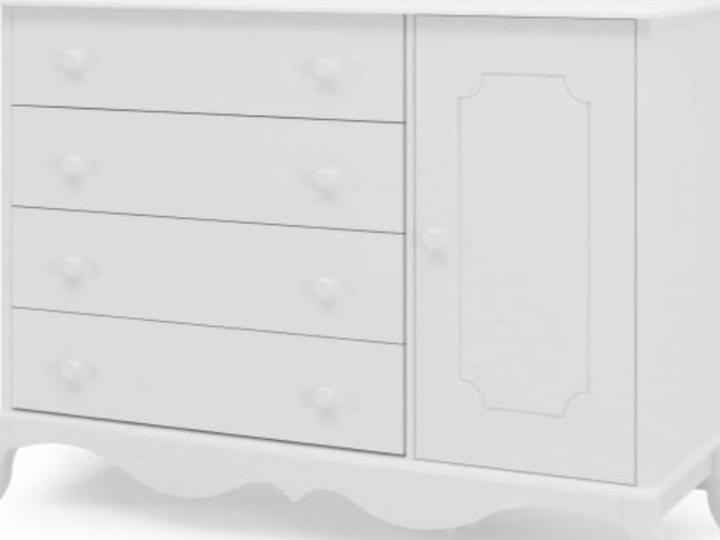 Producto fabricada 100% en MDF, Pintura atóxica más un baño UV. Armada en una base de madera estilo Imperial, Cajones con correderas telescópicas, puerta detalle bajo relieve tiene un mini closet con colgador metálico y una repisa.