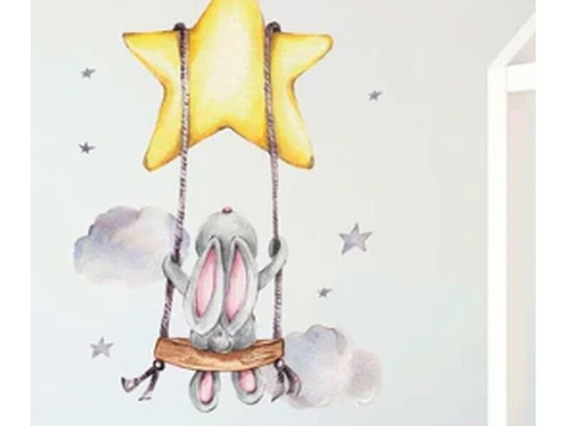 Hermoso Adhesivo o calcomanía decorativa de pared infantil conejito en columpio de estrella