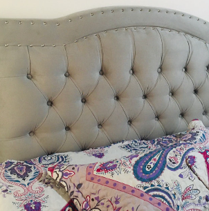 Cabecera para cama matrimonial, tapizada en tela beige con diseño acolchado.