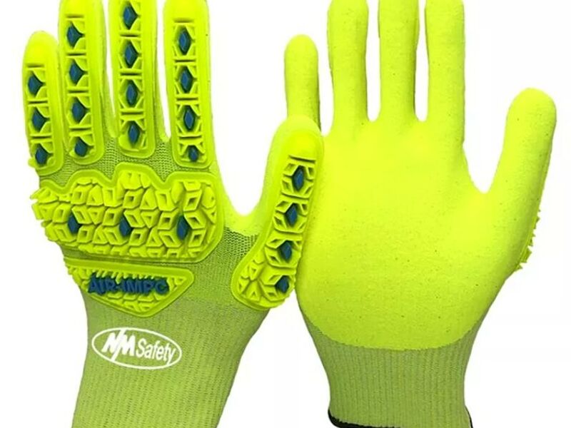 Calibre 18, Tejido de naylon, HPPE y fibra de acero, guantes recubiertos con palma de nitrilo arenoso. Goma termoplástica-TPR prensada en caliente en el dorso.