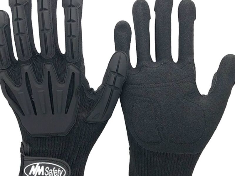 Calibre 13, tejido de Nylon, HPPE y fibra de acero, guantes recubiertos con palma de nitrilo arenoso. Goma termoplástica-TPR cosida en la parte trasera. Acolchado antivibración en la palma. Refuerzo entre el pulgar y el índice.