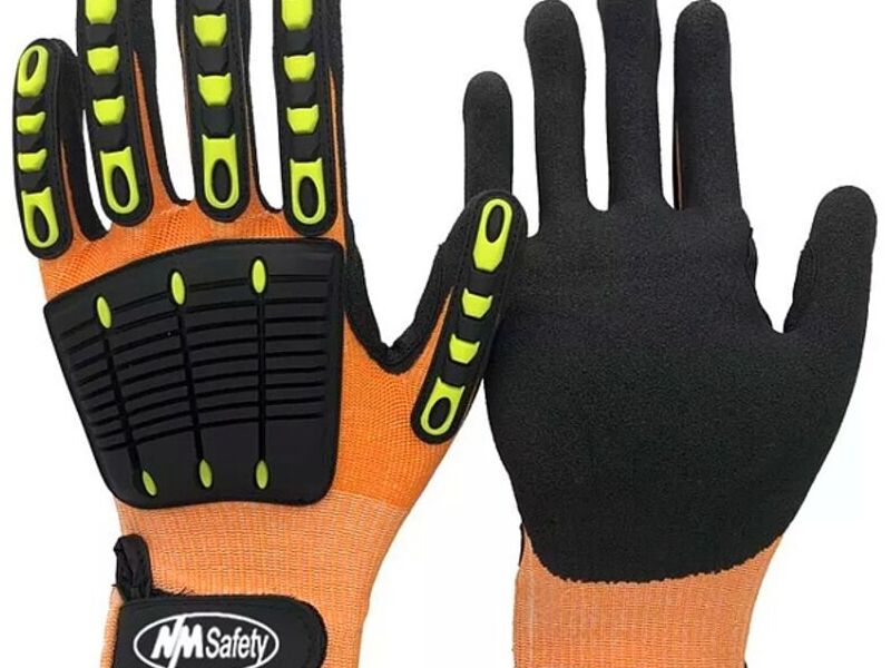 Calibre 13 Forro tejido de fibra de vidrio, HPPE y nylon, guantes recubiertos con palma de nitrilo arenoso. Goma termoplástica-TPR cosida en la parte trasera. Acolchado antivibración en la palma. Refuerzo entre el pulgar y el índice. Velcro en puño.