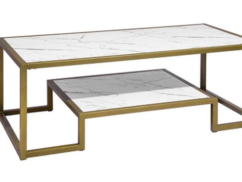 Preciosa mesa de centro de dos niveles con estructura de acero resistente, con superficie fabricada en MDF, esta maravillosa mesa le aportará sin duda elegancia y estilo al ambiente.