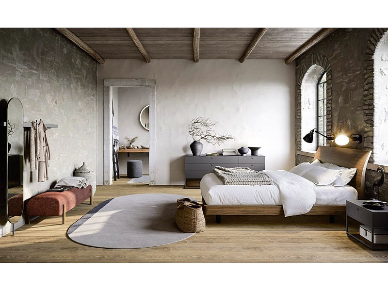 La combinación entre la cabecera Bend arqueada y el aro de cama con ángulos redondeados da vida a una composición armoniosa y equilibrada, en sintonía tanto con los dormitorios modernos como con un estilo de mobiliario y arquitectura más tradicional. La cama Bend está disponible también en versión con contenedor y mecanismo de elevación manual, que permite subir el somier para hacer la cama con mayor comodidad.