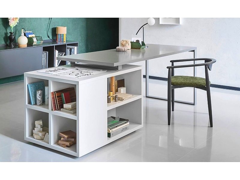 Isola es un escritorio compuesto por un elemento bajo que puede utilizarse como librería o como apoyo para la superficie de trabajo. Disponible en todos los lacados mates, ecomadera y texturizados.