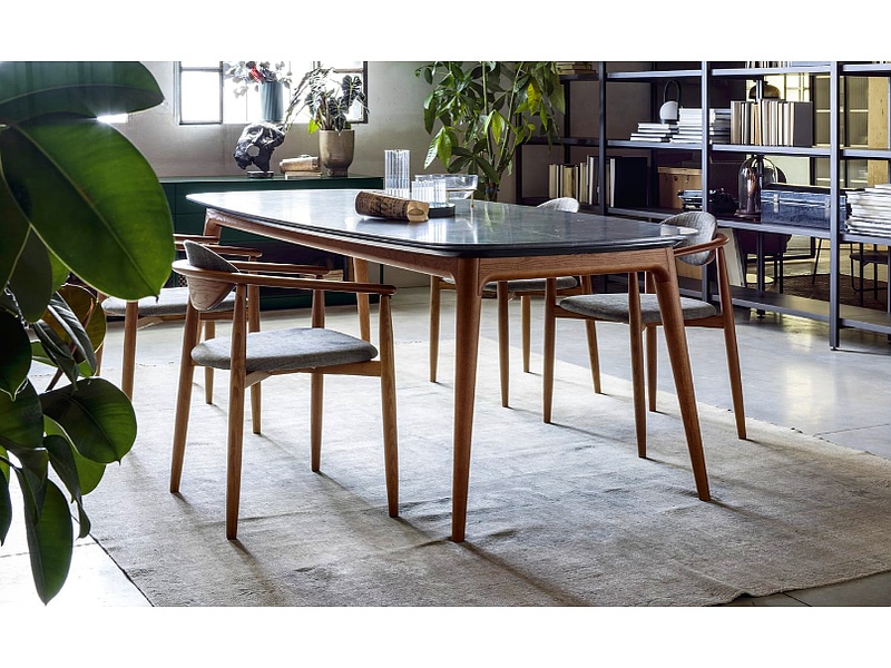 Líneas fluidas y atención al detalle son los rasgos distintivos de la mesa Hanami, diseñada por Matteo Zorzenoni. Las patas inclinadas y afiladas hacia el suelo confieren dinamismo y ligereza. El sobre puede ser de mármol de Carrara bianco mate o brillante, mármol Oriente grisio mate o brillante, mármol verde Guatemala, piedra lávica, noce canaletto o rovere chiaro, rovere carbone y de todos los colores lacados mates, con patas de color noce canaletto o rovere carbone.