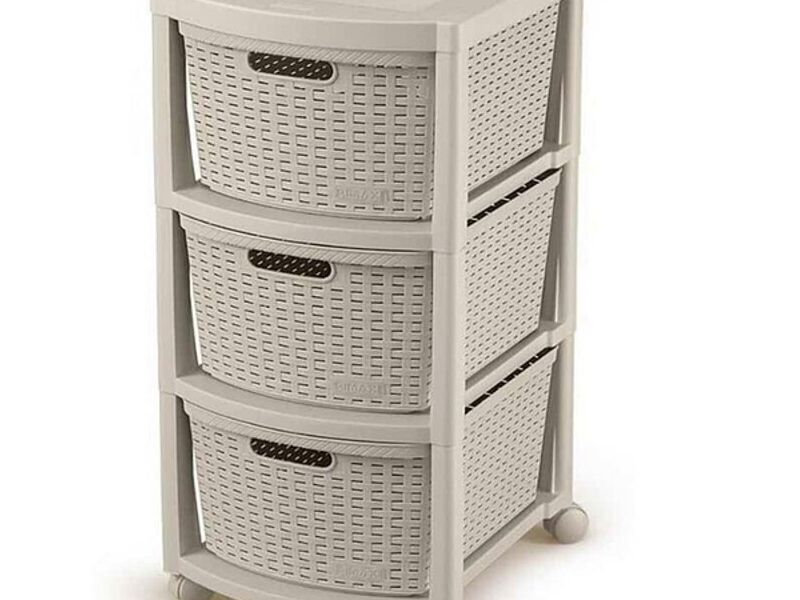 Cajonero con apariencia de Rattán con 3 cajones que se pueden retirar y mover fácilmente gracias a las asas integradas. Completamente plástico y con ruedas que permiten moverlo con facilidad.