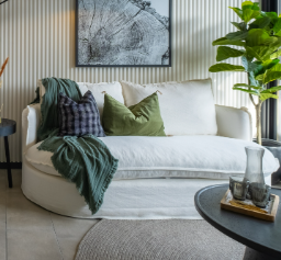 Sillón amplio con reposapiés a juego y cojines decorativos.