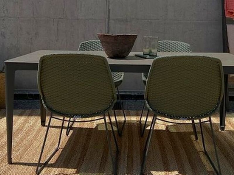 Mesa Nicola 180, ideal para seis personas, de cubierta de piedra y patas de fierro. Silla Agna, verde, de resina y aluminio electro pintado, 100% exterior.