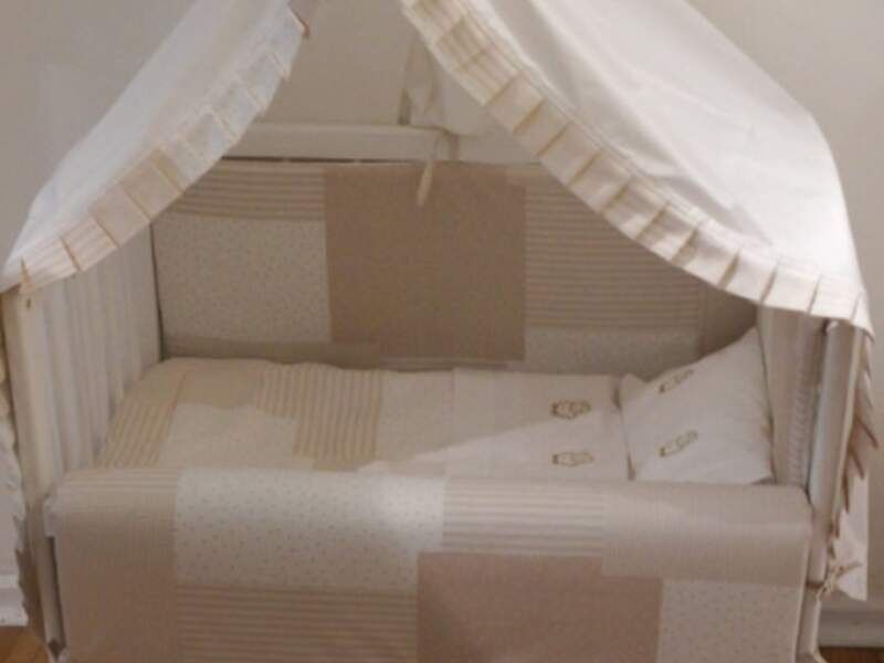 Cuna lacada en blanco, madera Raulí, confeccionada con telas importadas.