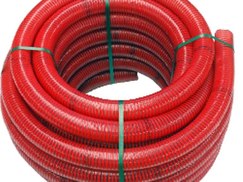 Manguera de PVC flexible color rojo translúcido, con espiral reforzado en PVC rígido prácticamente indeformable y antichoque, que le otorgan gran rigidez. Atóxica y de uso alimentario.