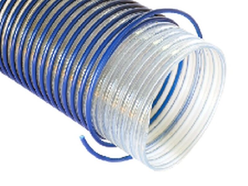 Manguera de PVC flexible color traslúcido, con espiral reforzado en PVC rígido, color azul. El espiral desprendible facilita el acoplamiento y fijación de conexiones y abrazaderas.